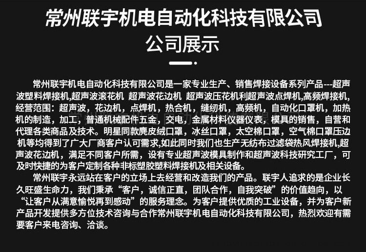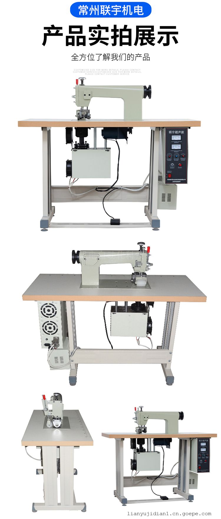 品牌:联宇 型号:LY-CSB70S 切割能力:30M/min 空载转速:30 rpm 额定功率:2100 w 电源类型:交流电源 电源电压:220V 功率:2100 w 适用范围:布料面料皮革 重量:120 kg 单电机标准超声波花边机布料切割压花机器,又称超声波压边机、超声波焊接机,是一种高效的缝合、焊接设备。主要用于合成纤维布料的缝边、熔接、熔切、压花等,加工产品具有水密性好,生产效率高,不用针线辅料,熔切面平滑无毛边,手感好等特点。广泛应用于各种编织袋、包装袋、服装、玩具、食品、环保无纺布袋、无纺布加工等行业。联宇主要机型包括:70s,70Q/100s,100Q/200s,200Q超声波花边机,非标超声波花边机等设备,满足各个行业对缝合机,花边机的需求。我们承诺:为您量身定制各种非标布类缝切设备(自动化设备)。花轮尺寸:6cm、7cm、10cm、18cm、20cm等