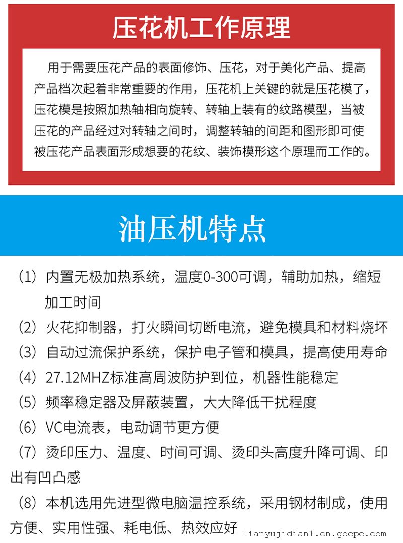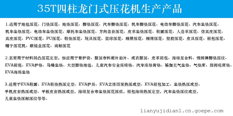 主营产品:压花机(服装面料压花机、毛巾干发巾压花机,摩托车坐垫热合压花机,电动车坐垫压花机,脚垫门垫压花压字机,3D凹凸平板压花机、PVC发泡板立体压花机、皮革压标机压花机、EVA材料压花纹机械、皮革布料复合海绵坐垫类立体压花机、鞋垫压花成型机,超声波复合压花压棉机裥棉机、以上设备可订制造PLC全自动等等)