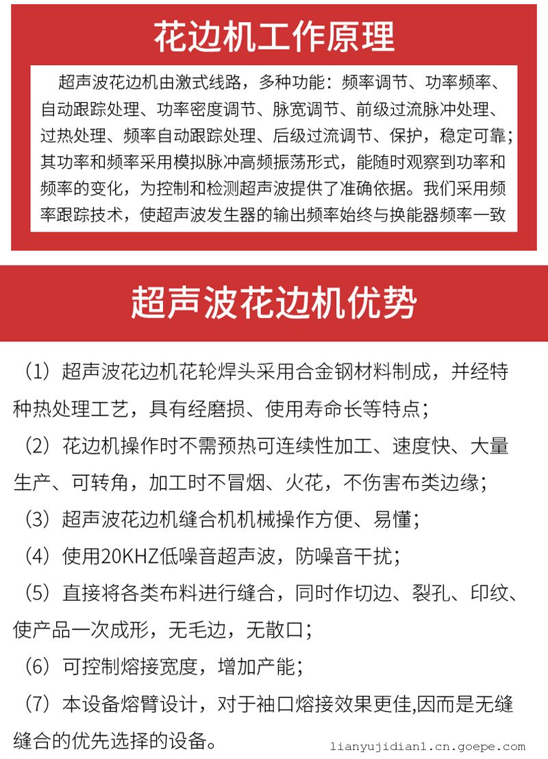 用途及特点:超声波切边机适用于塑料切边、塑料压花边、塑料封口;其性能优越,切边同时修边,单边切除,并进行熔边效应,使边缘光滑顺畅不粗糙,无毛边,达到质量的要求。
